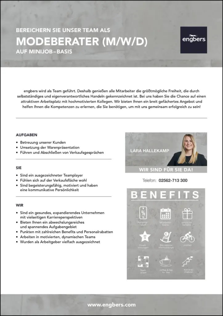 Modeberater (M/W/D) auf Minijob-Basis bei engbers gesucht